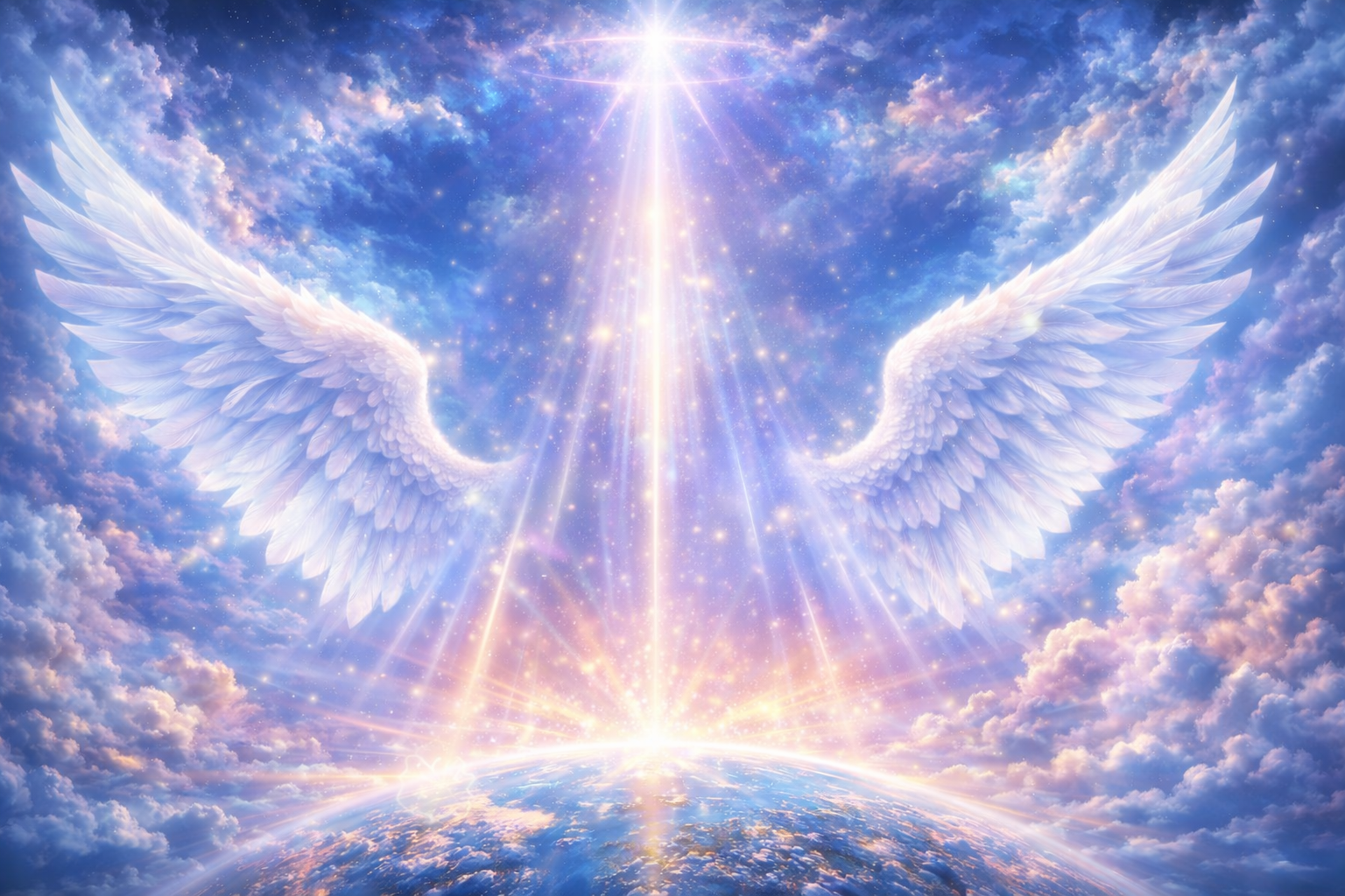 Digital artwork of angelic wings in the sky, with sunlight shining from above and Earth below, set against a backdrop of clouds and stars.