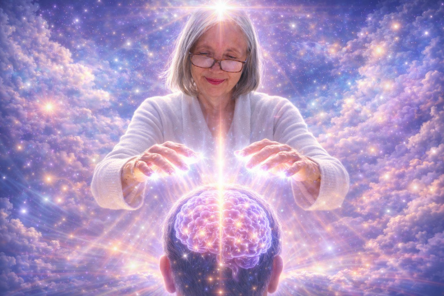 An elderly woman with gray hair and glasses gently holds her hands over a young woman lying in bed with closed eyes. Bright, glowing, golden light and cosmic sparkles flow from the elderly woman's hands to the young woman's chest, creating a magical, spiritual scene.